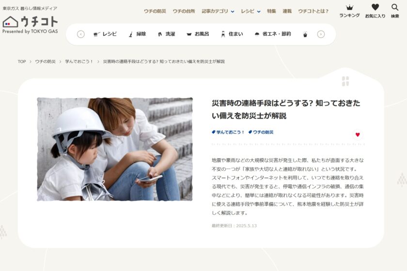東京ガスくらし情報メディア【ウチコト】に、徳山が執筆した『災害時の連絡手段はどうする? 知っておきたい備えを防災士が解説』の記事が掲載されました。 災害時の安心につながるヒントにしていただけたら嬉しいです 災害時の連絡手段はどうする? 知っておきたい備えを防災士が解説 | 東京ガス ウチコト 中津市の防災を考える日「防災講演会」 前の記事 食を通して親子で楽しく防災を学ぶ「ペットボトルピザ」 次の記事