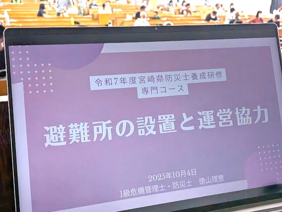 宮崎県で開催されている防災士養成研修会で、徳山が「避難所」を担当しました。
